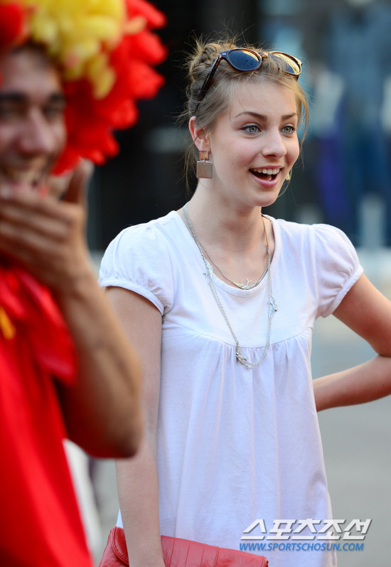 축구팬들이 마지막 축제를 즐기기 위해 한 자리에 모였다. 2일(한국시각) 우크라이나 키예프 올림픽스타디움에서 열리는 유로 2012 스페인과 이탈리아의 결승전을 앞두고 한 우크라이나 여성이 스페인 남성들과 사진을 찍고 있다.