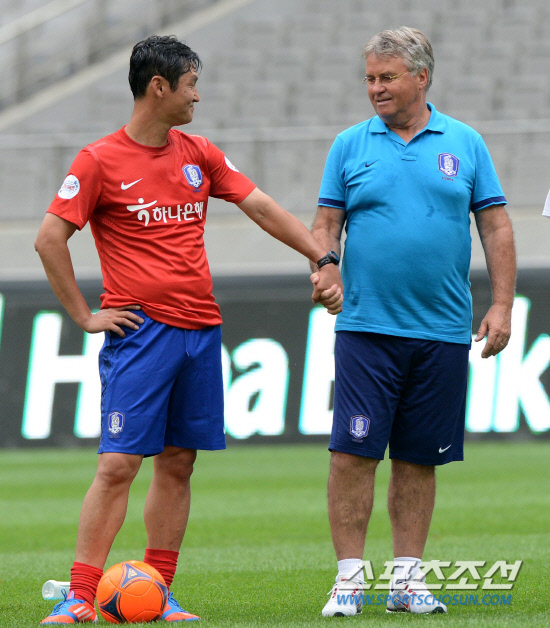 2막은 태극전사들과 거스 히딩크 감독의 재회했다. 기자회견을 끝낸 히딩크 감독이 그라운드에 모습을 드러내자 선수들은 훈련을 중단하고 곧바로 둥근 원을 그렸다. 히딩크 감독은 선수들과 일일이 악수를 나누며 농담을 주고 받았다. 이어 "만나서 반갑고 감회가 새롭다. 각 포지션에서 좋은 플레이를 해주길 바란다"는 것이 히딩크 감독이 태극전사들에게 10년 만에 건넨 첫 마디였다. '여유'는 히딩크 감독의 트레이드마크다. 'TEAM 2002' 주무를 맡고 있는 연맹 관계자가 통역을 위해 감독과 선수들이 몰려있는 곳으로 급하게 뛰어갔는데 곧바로 발길을 돌려야 했다. 히딩크 감독은 "영어를 잘하는 선수가 많다"라며 주무의 통역을 거부했다. 히딩크 감독의 지휘 아래 다시 재개된 훈련 분위기는 선수들 자체 훈련 분위기와는 180도 달랐다. 전운이 감돌았다. 선수들은 패스와 슈팅 하나하나에 집중했다. 컨디션이 가장 좋아 보인 선수는 최용수 서울 감독이었다. 크로스가 올라오는 족족 슈팅을 골로 연결시켰다. 최 감독은 너무 기쁜 나머지 히딩크 감독에게 달려가 안기는 세리머니를 펼치기도. 구슬땀을 흘린 최 감독은 훈련이 끝난 뒤 운동장 두 바퀴를 돌고 힘들어했다라는 소식을 들었다고 하자 "비밀을 유지해야 하는데…"라며 재빠르게 버스에 올라탔다. 상암=김진회 기자 manu35@sportschosun.com