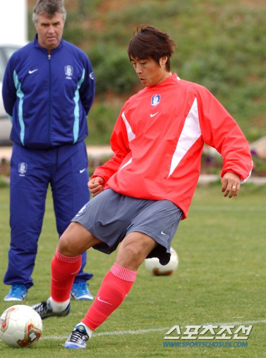 ◇2002년 3월 스페인 전훈에서 이동국의 슈팅을 지켜보고 있는 히딩크 감독. 스포츠조선 DB
