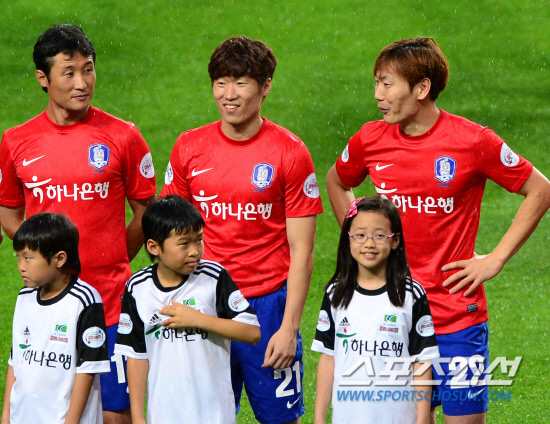 5일 서울월드컵경기장에서 열린 '2002년 월드컵대표팀 초청 하나은행 K-리그 올스타전 2012'. 식전행사를 마친 뒤 선수들이 입장을 시작했다. TEAM2002 선수와 TEAM2012 선수가 나란히 2002년둥이 에스코트키즈들와 손을 함께 그라운드에 모습을 드러냈다.