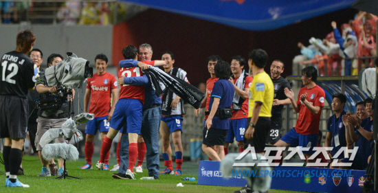 2002 대표팀과 2012 K리그 올스타가 진검승부를 펼친다. 2002 월드컵 대표팀 초청 하나은행 K리그 올스타전 2012 경기가 5일 서울월드컵경기장에서 열렸다. 전반 박지성이 골을 성공하고 히딩크 감독 품에 안겨 환호하고 있다.