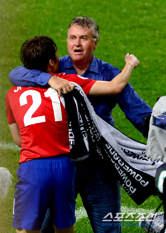 10년 전인 2002년 6월 14일 둘의 각본없는 드라마가 세상에 나왔다. 포르투갈과의 조별리그 최종전이었다. 후반 25분 감각적인 발리슛으로 골문을 연 박지성은 '쉿 세리머니'를 한 후 히딩크 감독에게 내달렸다. 박지성이 히딩크 감독의 품에 안기는 순간 대한민국은 구름 위를 걸었다. 16강 그림이 완성됐다. 히딩크호는 이어 16강 이탈리아, 8강 스페인을 넘어 4강 신화를 완성했다.