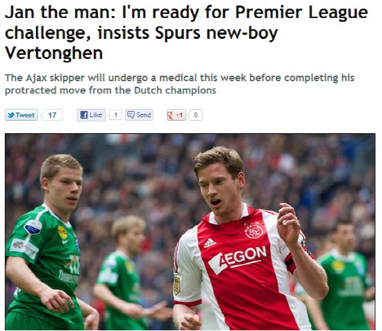 토트넘이 마침내 수비수 얀 베르통헨 영입에 성공했다.