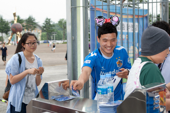 12일 울산-제주전이 시작하기 한 시간 전. 울산월드컵경기장 동쪽 맞은편에 위치한 구단 멀티숍에 울산의 미드필더 김승용(27)과 고슬기(26)가 나타났다. 팬들은 의아해했다. 몸을 풀고 경기를 준비해야 할 선수들을 보고 놀랐다. 김승용과 고슬기는 경고누적으로 제주전에 출전하지 못했다. 아쉬움은 팬들과의 소통으로 달래기로 했다. 1일 경기 진행 요원으로 깜짝 변신했다.