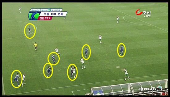 전북이 한 골을 앞섰다고는 하나 지친 기색은 더욱더 심해졌다. 그런데 문제는 수원의 경기력이 역전승을 거둘 정도로 완벽하지 않았다는 데 있었다. 힘 빠진 전북을 맘껏 갖고 놀지 못한 가장 큰 이유로는 중앙 미드필더 라인의 역할 수행 부족을 꼽고 싶다. 수원은 스테보-이상호, 그리고 측면의 에벨톤C-서정진, 기본 4명으로 공격진을 꾸렸다. 그 과정에서 측면 수비들의 오버랩 가담이 적절하게 이뤄지지 않을 땐, 중앙의 이용래-오장은 라인이 위로 과감히 올라가 공격적인 지원에 열을 올려야 했다. 이와 함께 수비 라인도 끌어올려 라인 간 간격을 좁힌 콤팩트한 경기를 할 필요가 있었다. 그렇게 해야 공격이 끊겨도 전북의 공격을 윗선에서부터 차단해 재차 공격을 시도할 수 있는 발판이 마련된다.