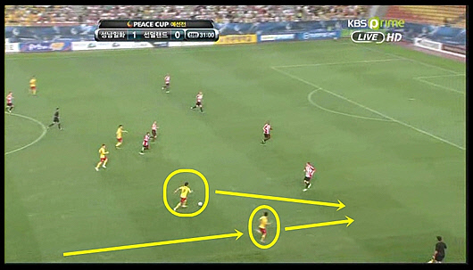 압박 선을 높게, 그리고 라인 간 간격을 좁게 형성하다 보면 최종 수비라인과 골키퍼 사이의 공간은 자연스레 넓어지게 된다. 이에 착안해 성남이 노린 곳이 바로 선더랜드의 측면 뒷공간이었다. 왼쪽의 남궁웅-홍철도 열심히 문을 두드렸지만, 오른쪽의 박진포-에벨톤의 존재감에는 미치지 못했다. 2009년 홍철, 2010년 김성환에 이어 신태용 감독의 '대박 신인 발굴 프로젝트' 2011년 판인 박진포는 더욱더 무르익은 실력을 피스컵 무대에서도 맘껏 뽐냈다. 공격-수비 양면에 걸쳐 안정된 플레이를 보여줬는데, 특히 오버래핑을 해야 할 때를 알고 앞으로 돌진하는 그의 뒷모습은 얼마나 아름다웠는지 모른다. 덕분에 에벨톤의 개인 능력을 활용할 기회도 늘어났다.