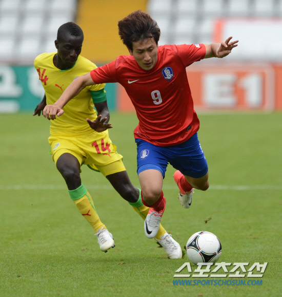 2012 런던올림픽 축구 대표팀의 지동원이 20일(현지시간) 런던 인근 스티브니지 라멕스 스타디움에서 열린 세네갈과의 평가전에서 GUEYE Idrissa의 수비를 제치다가 쓰러지고 있다.