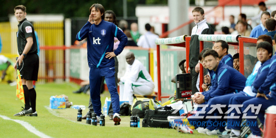 2012 런던올림픽 축구 대표팀의 홍명보 감독이 20일(현지시간) 런던 인근 스티브니지 라멕스 스타디움에서 열린 세네갈과의 평가전에서 선수들에게 수비 위치를 지시하며 독려하고 있다.