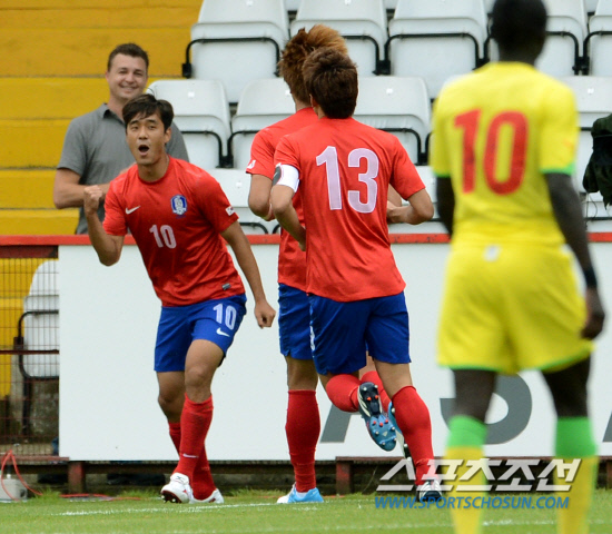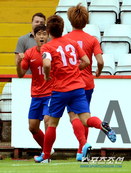 2012 런던올림픽 축구 대표팀의 박주영이 20일(현지시간) 런던 인근 스티브니지 라멕스 스타디움에서 열린 세네갈과의 평가전에서 전반 팀의 두번째 골을 넣은 뒤 환호하고 있다.