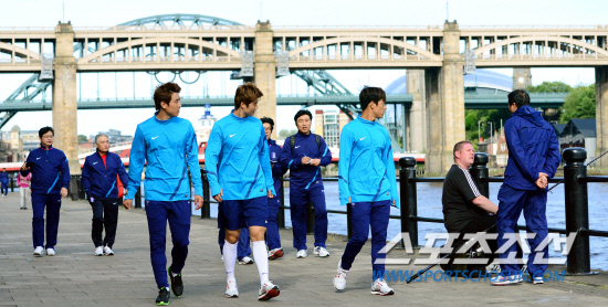 2012 런던올림픽 축구 대표팀의 구자철, 기성용, 박주영 등이 21일(현지시간) 뉴캐슬에 도착해 호텔 인근 타인(Tyne)강 강변로에서 산책으로 컨디션을 조절하던 중 강가에서 낚시를 즐기는 시민을 살피고 있다.
