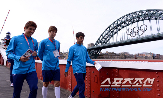 올림픽 축구대표팀 구자철, 기성용, 박주영(외쪽부터)이 21일(현지시간) 멕시코전이 열리는 영국 뉴캐슬에 입성, 오륜마크로 디자인된 타인브리지 강변로에서 산책으로 회복훈련을 대신하고 있다.
