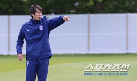 올림픽 축구대표팀 홍명보 감독이 22일(현지시간) 영국 뉴캐슬대학 코크레인 파크 스포츠클럽에서 선수들의 훈련을 독려하고 있다.
