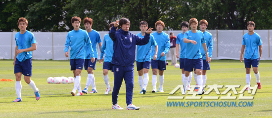 올림픽 축구대표팀 홍명보 감독이 22일(현지시간) 영국 뉴캐슬대학 코크레인 파크 스포츠클럽에서 선수들의 훈련을 독려하고 있다.