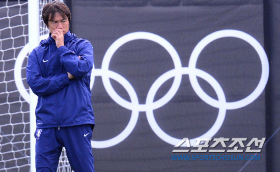 올림픽 축구대표팀 홍명보 감독이 22일(현지시간) 영국 뉴캐슬대학 코크레인 파크 스포츠클럽에서 열린 훈련에서 선수들의 훈련을 지켜보고 있다.