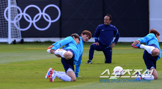 올림픽 축구대표팀 선수들이 22일(현지시간) 영국 뉴캐슬대학 코크레인 파크 스포츠클럽에서 열린 훈련에서 몸을 풀고 있다.