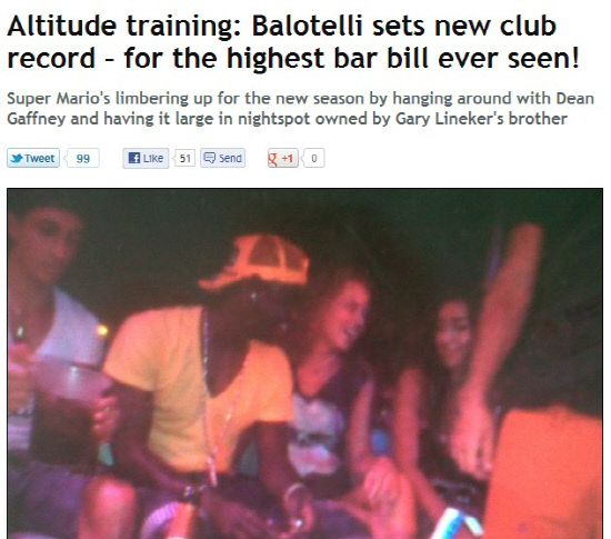 발로텔리는 클럽에 가겠다고 예약을 한 뒤, 가장 비싼 테이블을 잡았다. 이 테이블 최소 5000유로를 써야 사용이 가능하다. 곧 하루에 20명까지만 예약이 가능한 특급 침실도 함께 예약한 것으로 알려졌다. 그는 한병에 600파운드를 호가하는 보드카를 마시며 놀았다. 웨인 리네커는 "발로텔리는 우리 클럽서 정말 재밌게 보냈다. 정말 흥미로운 사람이다"고 했다.