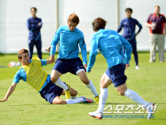 2012 런던올림픽 축구 대표팀의 구자철(왼쪽)과 기성용이 23일 뉴캐슬 대학 코크레인파크 스포츠클럽에서 진행된 청백전 경기 중에 치열한 볼다툼을 벌이고 있다.