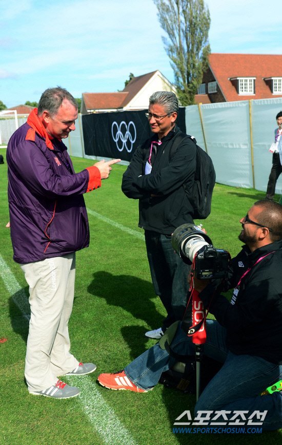 2012 런던올림픽 축구 대표팀의 조별 리그 첫 상대인 멕시코 축구대표팀의 미디어 담당관(오른쪽 위에서 두번째)이 멕시코 취재진과 함께 23일 뉴캐슬 대학 코크레인파크 스포츠클럽에서 진행된 한국 대표팀의 훈련을 취재하던 중 훈련장 관계자에게 아이디를 확인받고 있다.