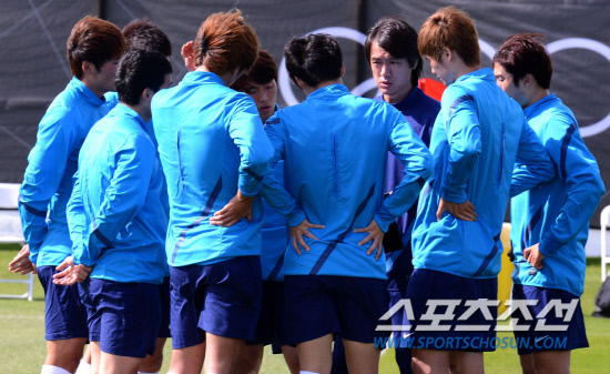 올림픽 축구대표팀 홍명보 감독이 23일(현지시간) 영국 뉴캐슬대학 코크레인 파크 스포츠클럽에서 거세게 부는 바람을 맞으며 훈련하는 선수들을 독려하고 있다.