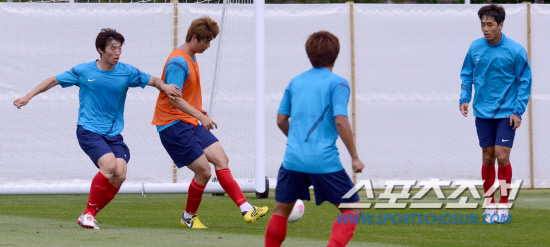 올림픽 축구대표팀 선수들이 24일(현지시간) 영국 뉴캐슬대학 코크레인 파크 스포츠클럽에서 미니게임을 하고 있다.