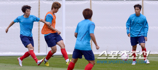 올림픽 축구대표팀 선수들이 24일(현지시간) 영국 뉴캐슬대학 코크레인 파크 스포츠클럽에서 미니게임을 하고 있다.