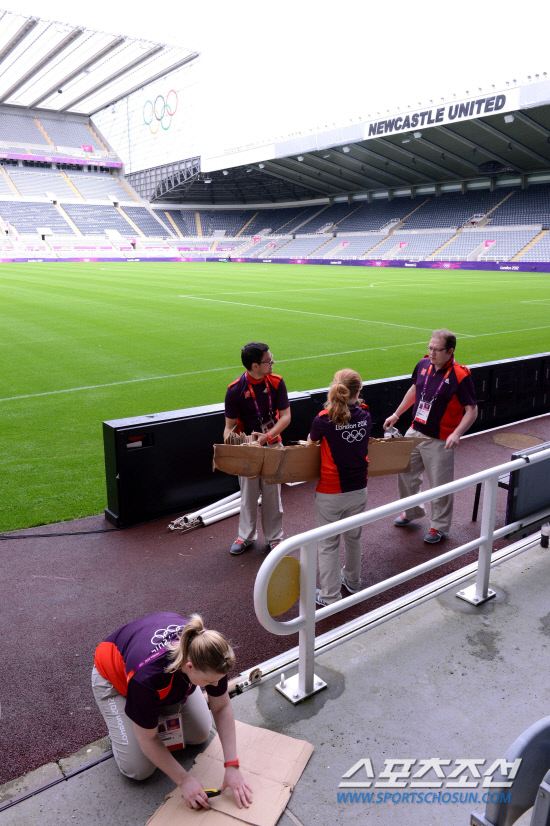 올림픽 축구대표팀과 멕시코의 첫 경기를 하루 앞둔 25일(현지시간) 뉴캐슬 유나이티드 홈구장인 세인트 제임스 파크 스타디움에서 올림픽 패밀리들이 선수들을 맞을 준비를 하고 있다.