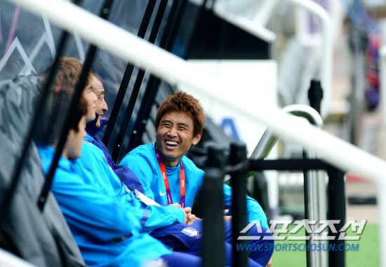 2012 런던 올림픽 축구대표팀의 구자철이 조별리그 첫 상대인 멕시코전을 하루 앞둔 25일 세인트 제임스 파크 경기장을 둘러보던 중 벤치에 앉아 담소를 나누며 밝게 웃고 있다.