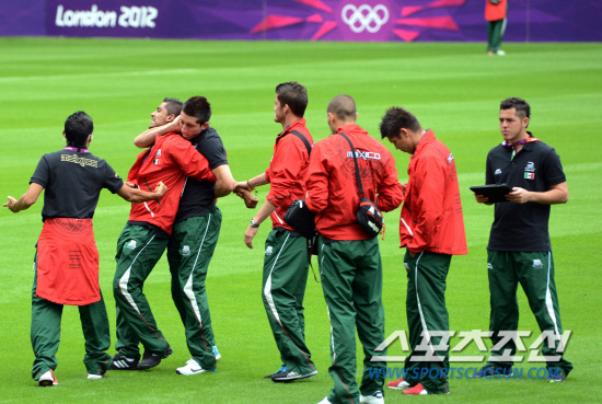 2012 런던 올림픽 축구대표팀의 조별리그 첫 상대인 멕시코 선수들이 경기 하루 전인 25일 세인트 제임스 파크 스타디움의 잔디를 점검하던 중 익살스런 장난을 치고 있다.