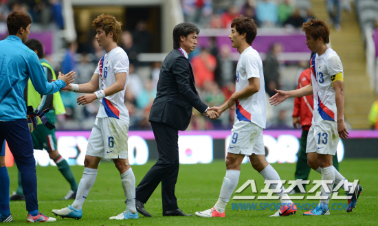 2012 런던올림픽 축구대표팀의 홍명보 감독이 26일(현지시간) 뉴캐슬의 세인트 제임스 파크 스타디움에서 열린 멕시코전에서 무승부로 경기를 마친 뒤 기성용, 지동원 등과 악수를 나누고 있다.