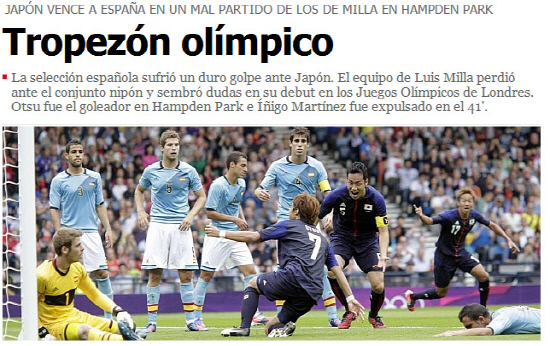 ◇2012년 런던올림픽 우승후보로 꼽혔던 스페인은 일본과의 첫 경기서 0대1로 패하며 이변의 첫 희생양이 됐다. 득점 직후 환호하는 일본 선수들과 망연자실한 스페인 선수들의 모습. 사진캡처=마르카 홈페이지