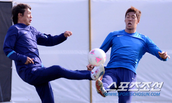 올림픽 축구대표팀 홍명보 감독과 이범영이 27일(현지시간) 영국 코벤트리 워윅대학 훈련장에서 미니게임 도중 볼을 차고 있다.