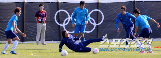 올림픽 축구대표팀 홍명보 감독이 27일(현지시간) 영국 코벤트리 워윅대학 훈련장에서 미니게임도중 볼을 잡기위해 몸을 말리고 있다.