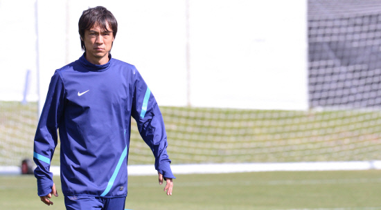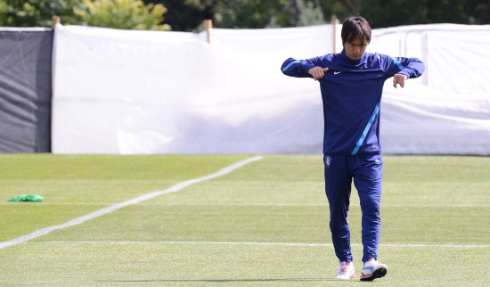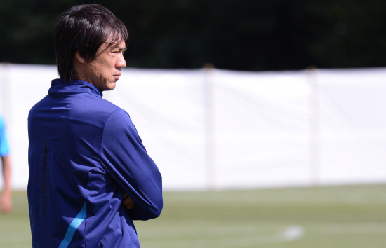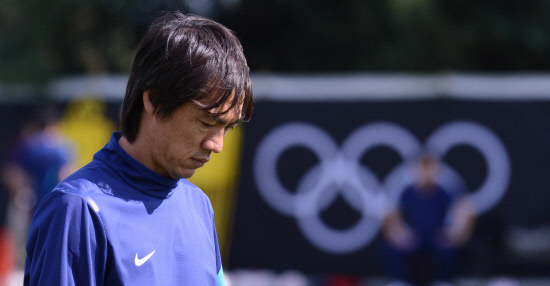 올림픽 축구대표팀 홍명보 감독이 28일(현지시간) 영국 코벤트리 워릭대학 훈련장에서 선수들의 훈련을 지켜보고 있다.