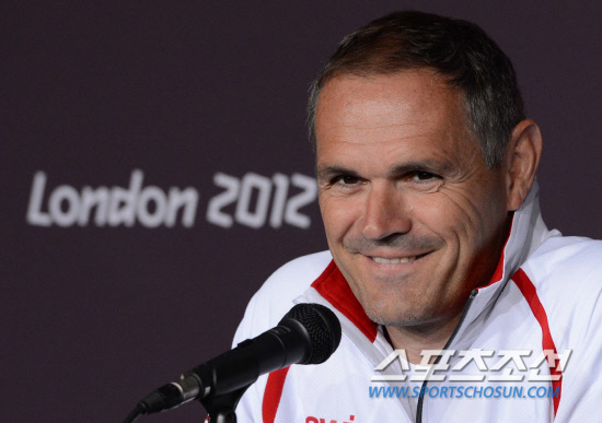 스위스 축구대표팀 타미 감독이 28일(현지시간) 영국 코벤트리 시티오브코벤트리 스타디움에서 열린 기자회견에서 기자들의 질문에 답하고 있다.