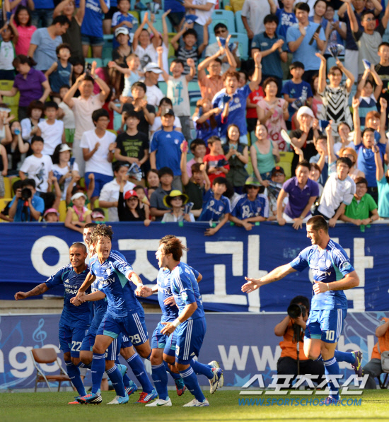 진심은 통하기 마련이다. 수원은 다시 날개를 폈다. 포문을 연 것은 곽희주 자신이었다. 전반 18분 문전 혼전 중 이어진 볼을 지체 없이 오른발슛으로 연결해 골망을 갈랐다. 곽희주가 준비한 또 하나의 무기가 나왔다. 수원 선수들은 손을 맞잡고 벤치로 달려가 윤성효 감독을 부둥켜 안았다. 성적 부진으로 매 경기마다 서포터스의 '퇴진 구호'를 들었던 윤 감독에게 보답하고자 하는 염원을 담았다. 모두가 하나가 된 벤치는 수원 삼성의 '힐링캠프'였다.