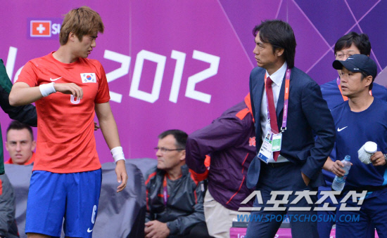 올림픽 축구대표팀 홍명보 감독이 29일(현지시간) 영국 코벤트리 시티오브코벤트리 스타디움에서 열린 스위스와의 경기에서 부상으로 실려나온 기성용의 상태를 살피고 있다.