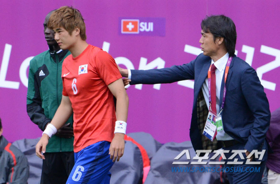 올림픽 축구대표팀 홍명보 감독이 29일(현지시간) 영국 코벤트리 시티오브코벤트리 스타디움에서 열린 스위스와의 경기에서 부상으로 실려나온 기성용의 상태를 살피고 있다.