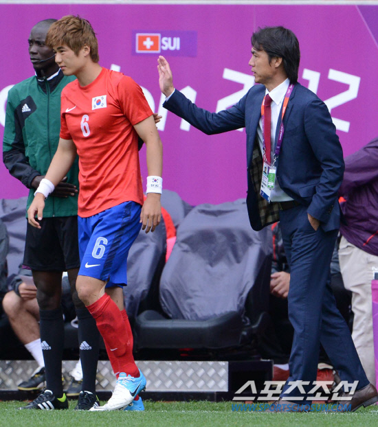 올림픽 축구대표팀 홍명보 감독이 29일(현지시간) 영국 코벤트리 시티오브코벤트리 스타디움에서 열린 스위스와의 경기에서 부상으로 실려나온 기성용의 상태를 살피고 있다.