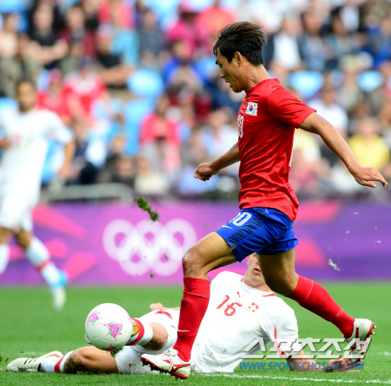홍명보호가 29일 영국 코벤트리에서 스위스와 런던올림픽 조별리그 2차전 경기를 펼쳤다. 박주영이 스위스 수비수의 태클을 피해 슈팅을 시도하고 있다.
