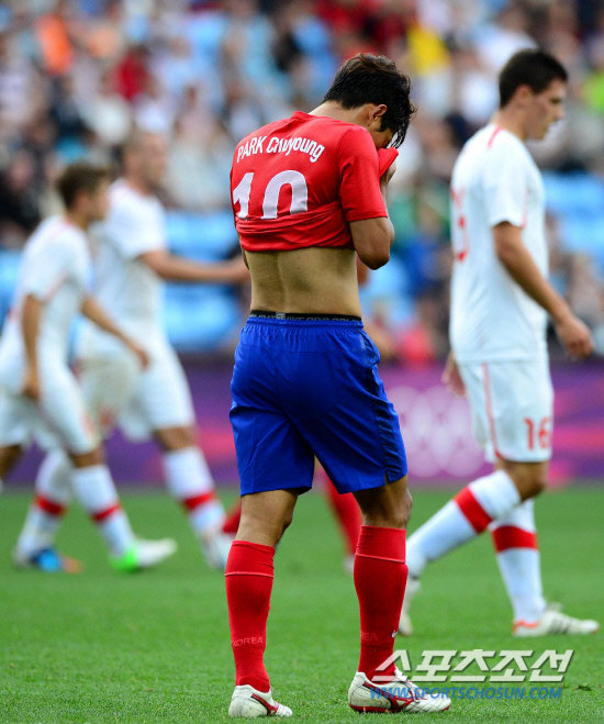 홍명보호가 29일 영국 코벤트리에서 스위스와 런던올림픽 조별리그 2차전 경기를 펼쳤다. 전반전을 0대0으로 마치고 박주영이 얼굴을 감싸며 그라운드를 나오고 있다.