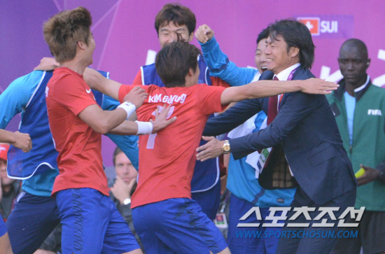 올림픽 축구대표팀 홍명보 감독과 선수들이 29일(현지시간) 영국 코벤트리 시티오브코벤트리 스타디움에서 열린 스위스와의 경기에서 김보경의 골때 기쁨을 나누고 있다.