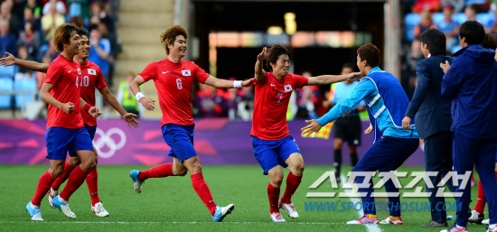 홍명보호가 29일 영국 코벤트리에서 스위스와 런던올림픽 조별리그 2차전 경기를 펼쳤다. 후반 김보경이 추가골을 성공시키고 홍명보 감독과 포옹을 위해 달려나오고 있다.