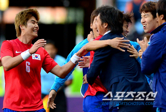 홍명보호가 29일 영국 코벤트리에서 스위스와 런던올림픽 조별리그 2차전 경기를 펼쳤다. 후반 김보경이 추가골을 성공시키고 홍명보 감독과 포옹을 나누고 있다.