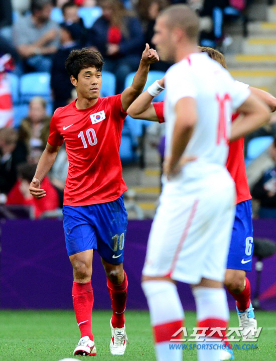 홍명보호가 29일 영국 코벤트리에서 스위스와 런던올림픽 조별리그 2차전 경기를 펼쳤다. 후반 박주영이 첫 골을 성공시키고 엄지손가락을 치켜들며 기뻐하고 있다.
