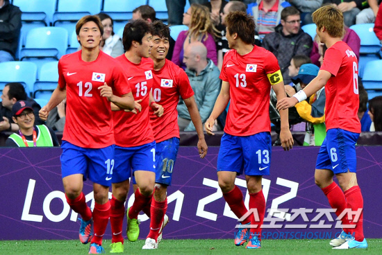 홍명보호가 29일 영국 코벤트리에서 스위스와 런던올림픽 조별리그 2차전 경기를 펼쳤다. 후반 박주영이 첫 골을 성공시키고 동료들과 함께 기뻐하고 있다.