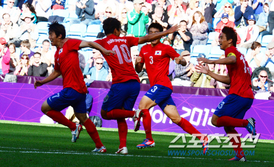 29일(현지시간) 오후 시티 오브 코벤트리 스타디움에서 열린 런던올림픽 축구 B조 예선 2차전 스위스와 경기에서 후반전 한국의 두번째골을 성공시킨 김보경이 동료들과 환호하고 있다.20120729. 코벤트리=올림픽사진기자단e