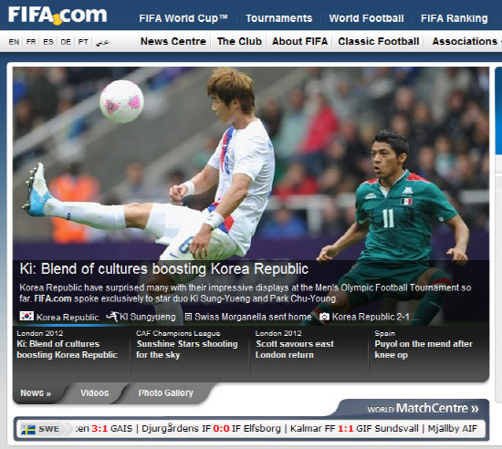 ◇국제축구연맹(FIFA)이 31일(한국시각) 공식 홈페이지를 통해 한국의 2012년 런던올림픽 선전과 키 플레이어 기성용에 대해 소개했다. FIFA는 "한국은 런던올림픽에서 축구를 진정으로 즐기는 팀"이라고 호평했다. 사진캡쳐=FIFA 공식 홈페이지