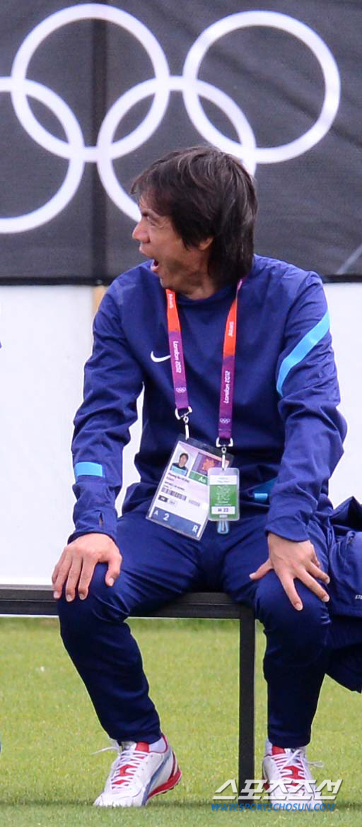 올림픽 축구대표팀 홍명보 감독이 31일(현지시간) 영국 런던 Long Lane Junior Football Club에서 열린 훈련에서 피곤한 듯 하품을 하고 있다.