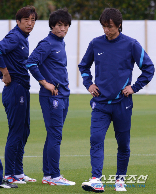 올림픽 축구대표팀 홍명보 감독이 31일(현지시간) 영국 런던 Long Lane Junior Football Club에서 열린 훈련에서 김태영 코치와 심각한 표정을 짓고 있다.