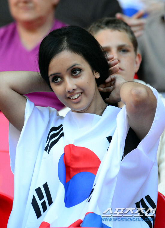 2012 런던올림픽 축구 대표팀의이 1일(현지시간) 런던 윔블리 스타디움에서 열린 조별 리그 3차 가봉전을 치르는 가운데 한국의 승리를 기원하는 팬들이 열띤 응원을 펼치고 있다.
